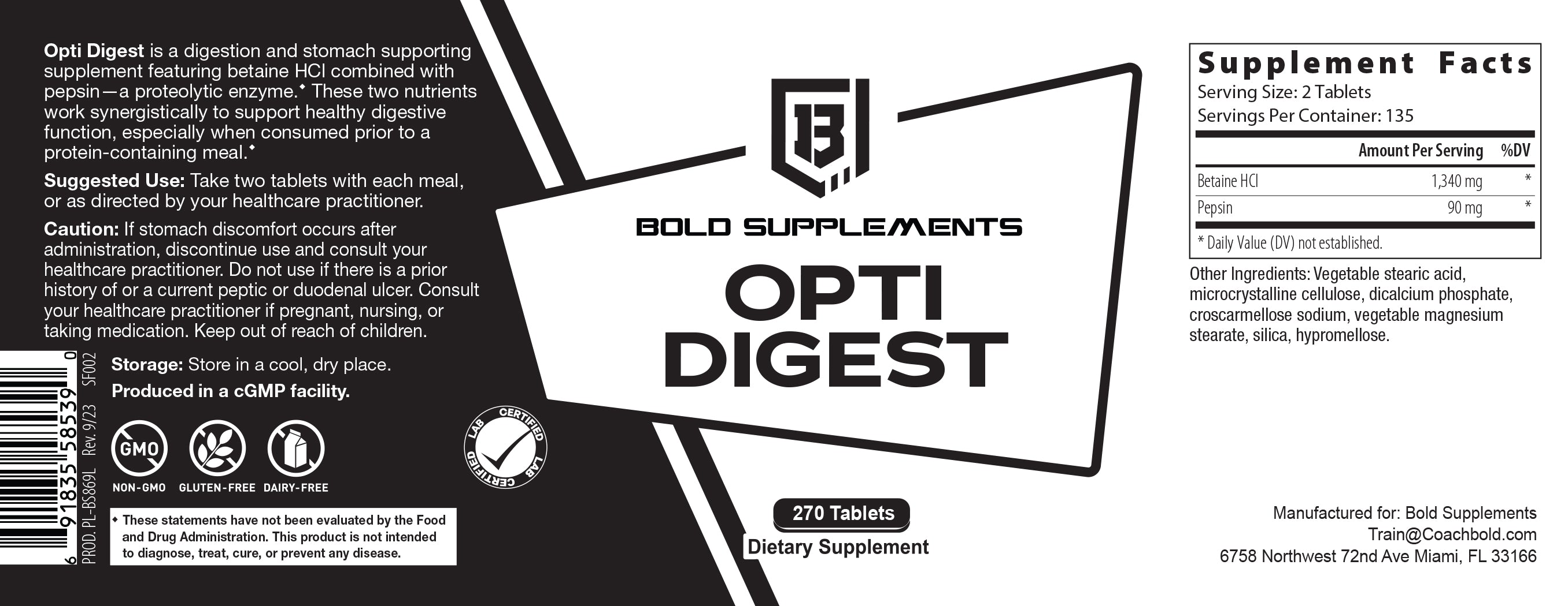 OptiDigest is a digestion and stomach supporting supplement featuring betaine HCl combined with pepsin—a proteolytic enzyme. These two nutrients work synergistically to support healthy digestive function, especially when consumed prior to a protein-containing meal.